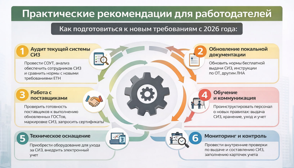 В-третьих, работодатель столкнётся с операционными изменениями, требующими ресурсов. Необходимо пересмотреть действующие контракты на поставку спецодежды, возможно, сменить некоторых поставщиков (например, если они не могут предоставить СИЗ по новым ГОСТам или с маркировкой), инвестировать в улучшение складского хозяйства для хранения СИЗ, организовать места для стирки и сушки спецодежды. Нужно обучить сотрудников отделов снабжения и охраны труда работать с новой документацией, электронной системой учёта. На первых порах это дополнительные нагрузки, но в перспективе правильная организация оборота СИЗ приведёт к более прозрачному учёту и оптимизации расходов (например, не будут закупаться лишние или неподходящие средства защиты).
